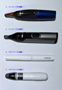 退職してから既に四半世紀経ちますが、我が洗面所の棚には電動鼻毛カッターが鎮座しています。認知症予備軍の隠居のこと、電動式を我が家にお迎えした時期はハッキリしませんが、2011年に現在のマンションに転居した後のことなので2010年代の中頃と思われます。現在洗面所の棚には下図の4機種が鎮座していますが、使うのは1番のフィリップス機と4番のパナソニック機です。