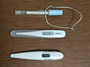 帰宅のタクシーの中で「診療所の体温計は電子式だった。」ことを思い出し、運転手氏に途中の薬局の前で止まって貰いました。店に飛び込んで電子体温計を購入しました。1995年のことですから、機種は多分オムロンのMC-30と思われます。残念ながらnet上には画像データが見つかりませんでした。但し、電子体温計の測定上限は42℃でした。