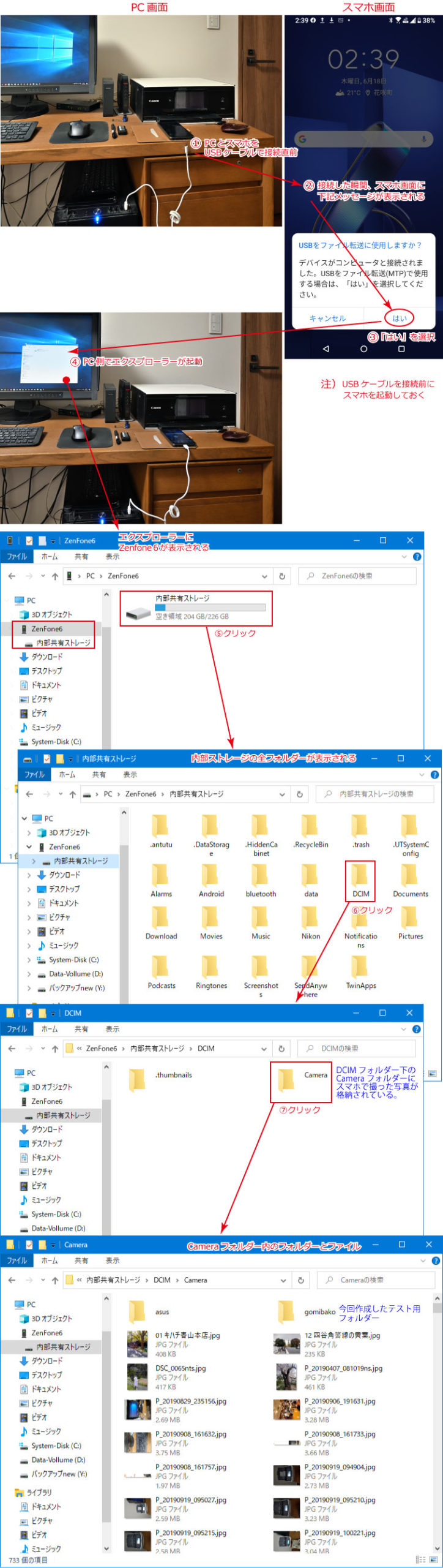 PCとスマホを有線接続すると、上の図のように Windows 10 のエクスプローラーで PC とスマホのフォルダー及びファイルが操作可能になります。ファイルの転送はエクスプローラーのコピペ操作で行います。